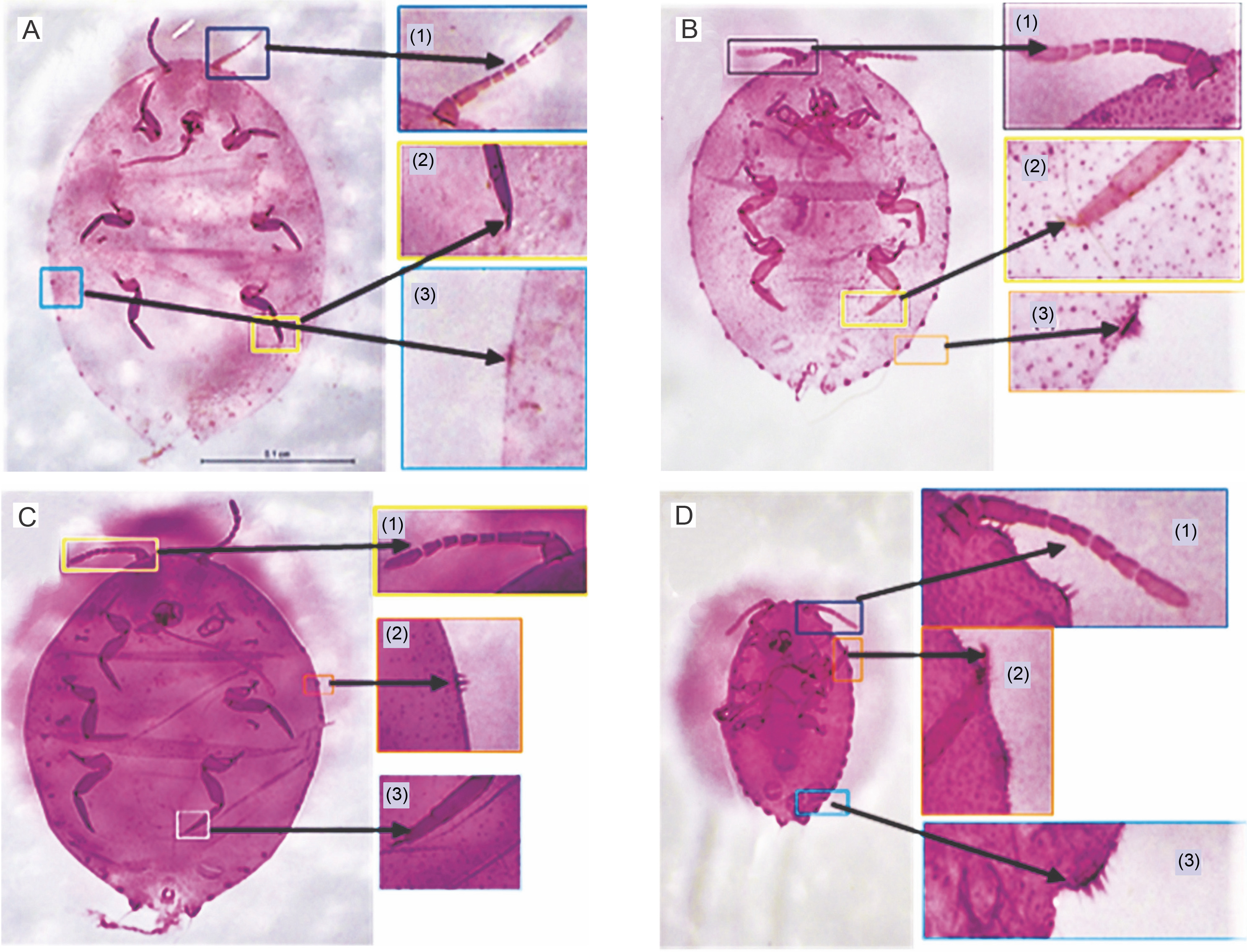 A) Whole-body slide with 18–19 pairs of cerarii showing (1) 8–9 segmented antennae, (2) a claw with no denticle and (3) setae with three coni; B) whole-body slide with 17 pairs of cerarii (1) 8 segmented antenna, (2) setae with three coni and (3) claws with no denticles; C) whole-body slide with 18 pairs of cerarii showing (1) presence of 8 segmented antennae, (2) setae with three coni and (3) claw with no denticles; D) whole-body slide with 17 pairs of cerarii showing (1) 8–9 segmented antenna, (2) claw with no denticles and (3) coni with 3–4 setae