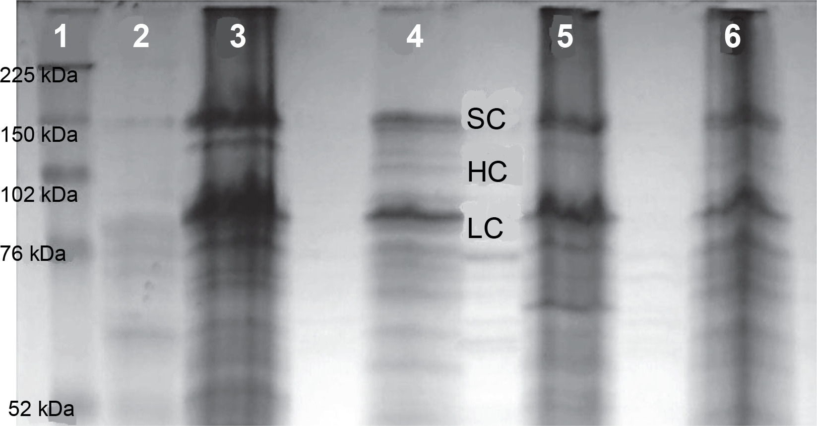 Expression level of the FVIII gene as revealed by SDS electrophoresis in a 12% polyacrylamide gel; 1 – protein marker Full Range Rainbow (Amersham), 2 – lysate of E. coli Z strain, 3 – (OD600 ~1.0) and 5 – (OD600 ~5.19) E. coli Z strain transformed with pDBFVIII plasmid, inclusion bodies isolated from LB + Tet medium, 4 – (OD600 ~1.0) and 6 – (OD600 ~4.50) E. coli Z transformed with pDBFVIII plasmid, inclusion bodies isolated from MM + Tet medium; SC – single chain, HC – heavy chain, LC – light chain
