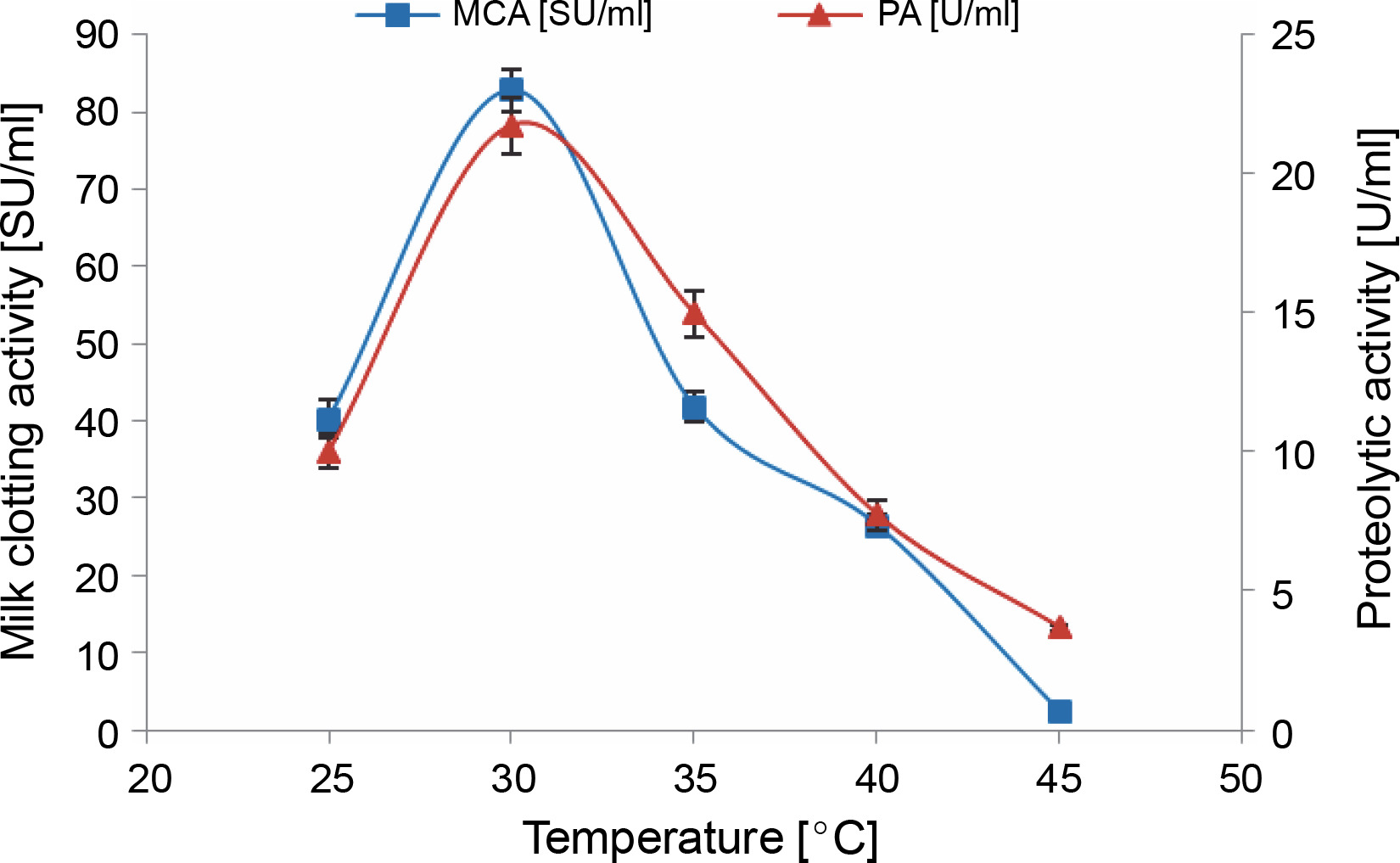 As depicted in Figure 5, temperature positively influenced protease production. The enzyme activities, MCA and PA, peaked after 3 days of incubation at 30°C (82.76 ± 2.85 SU/ml and 21.74 ± 1.02 U/ml, respectively). This value aligns well with the temperatures reported for maximum milk-clotting proteases production by various fungal and bacterial strains: F. subglutinans (Ghareib et al., 2001), Amylomyces rouxii (Yu and Chou, 2005), M. pusillus (Daudi et al., 2015), and B. amyloliquefaciens SP1 (Guleria et al., 2016) in liquid medium fermentation.