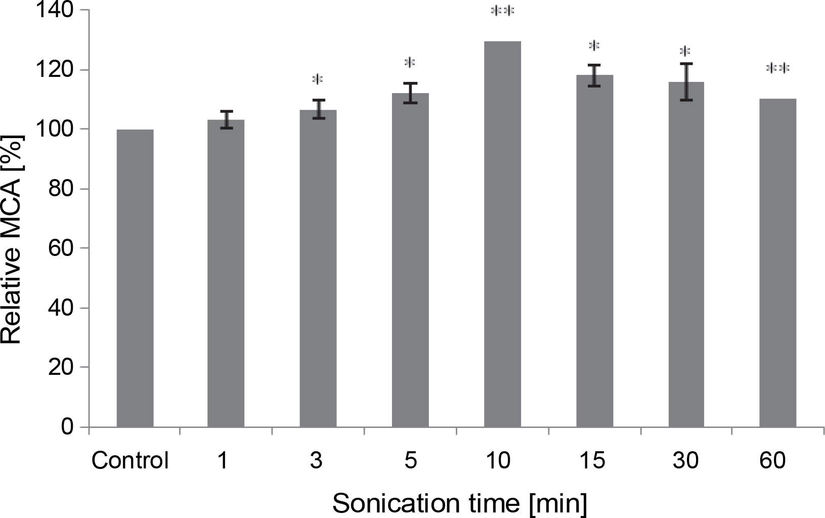 Influence of the sonication time on MCA of M. circinelloides crude extract (*P < 0.05, **P < 0.01)