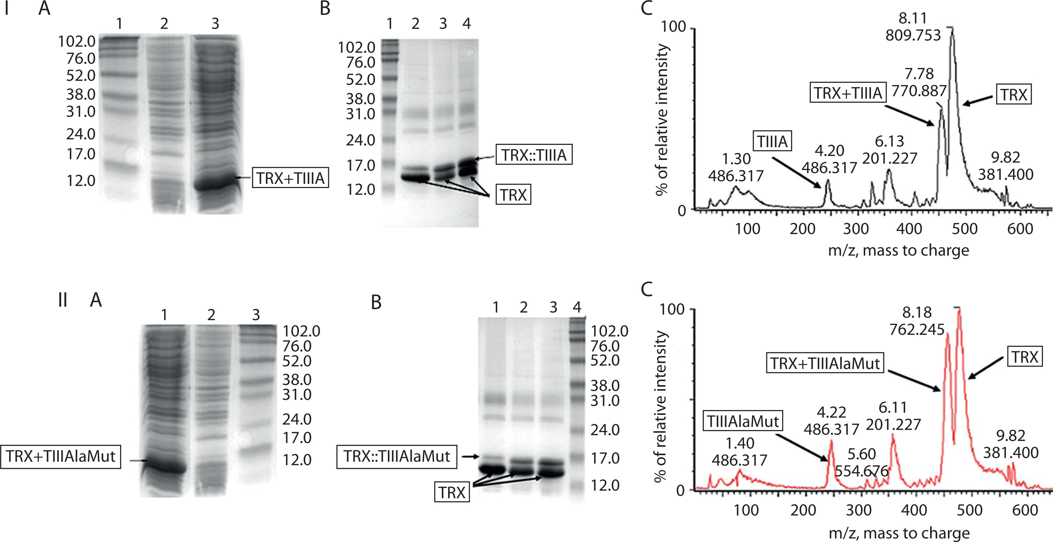Expression and purification of TIIIA and TIIIAlaMut from Escherichia coli. I) TIIIA. A) SDS-PAGE analysis of TIIIA expression. Lane 1: molecular-weight marker; lane 2: total protein from E. coli S4B without insert; lane 3: total protein from E. coli S4B/pDM-TIIIA. B) SDS-PAGE analysis of CNBr-digested TRX::TIIIA under different conditions. Lane 1: molecular-weight marker; lanes 2–4: digestion in 0.3 M HCl, 0.2 M HCl, and 0.1 M HCl for 3 h, respectively. C) LC-MS chromatogram illustrating separation of the TRX::TIIIA fusion protein. II) TIIIAlaMut. A) SDS-PAGE analysis of TIIIAlaMut expression. Lane 1: molecular-weight marker; lane 2: total protein from E. coli S4B without insert; lane 3: total protein from E. coli S4B/pDM-TIIIAlaMut. B) SDS-PAGE analysis of CNBr-digested TRX::TIIIAlaMut under different conditions. Lane 1: molecular-weight marker; lanes 2–4: digestion in 0.3 M HCl, 0.2 M HCl, and 0.1 M HCl for 3 h, respectively. C) LC–MS chromatogram showing separation of the TRX::TIIIAlaMut fusion protein