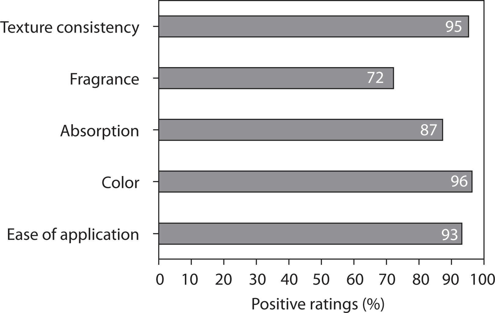The patient survey results evaluating product characteristics are shown in Figure 6. The cosmetic formulation was very well tolerated in terms of its physical and sensory properties. Over 90% of respondents rated texture, color, and application favorably, demonstrating excellent consumer acceptance.
