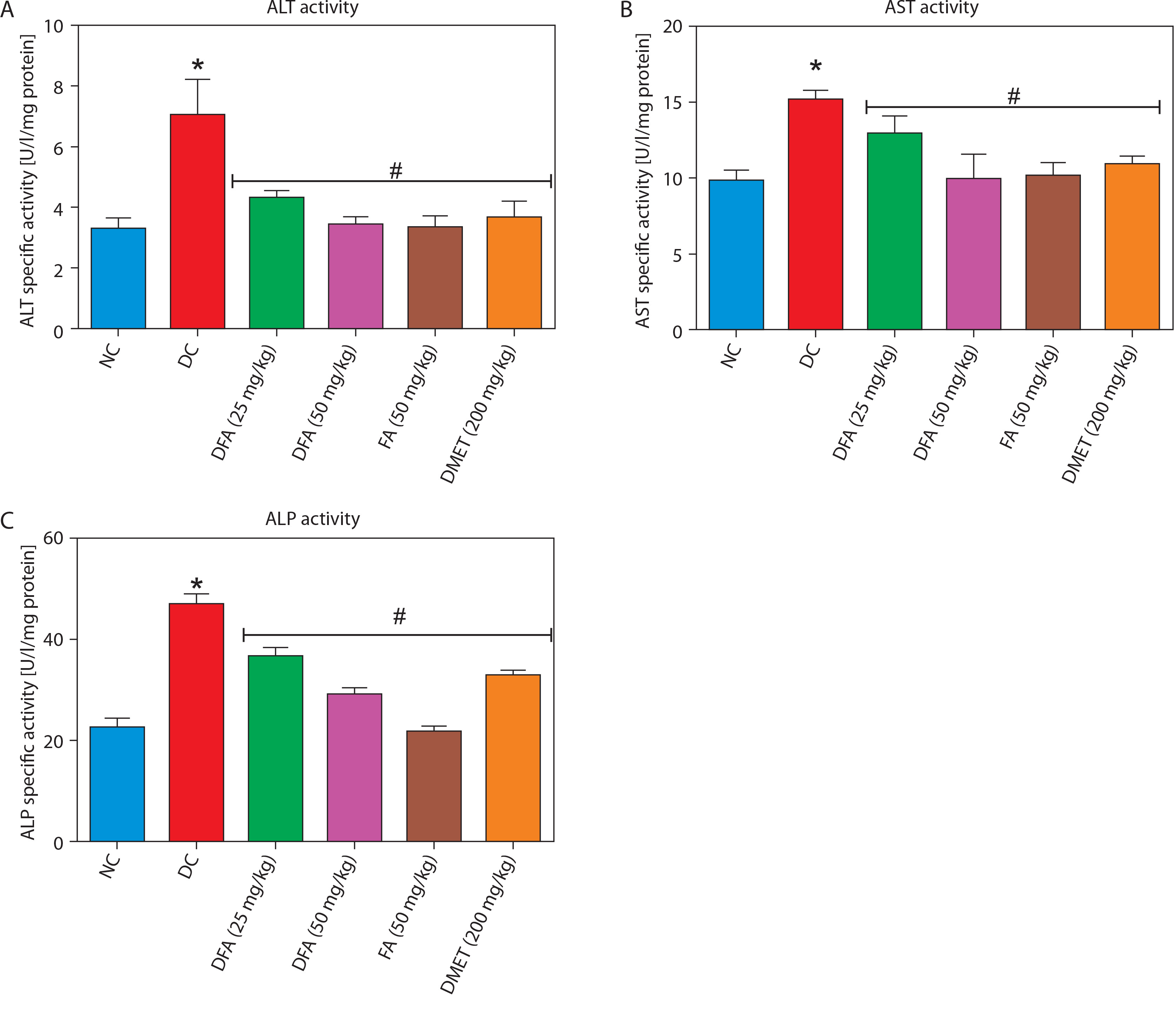 Effect of FA on levels of (A) ALT, (B) AST, (C) ALP. Values are mean ± SEM of five experimental animals (n = 5). Asterisk (*) represents a significant difference (p < 0.05) to the NC group, while # represents a significant difference (p < 0.05) to the DC group