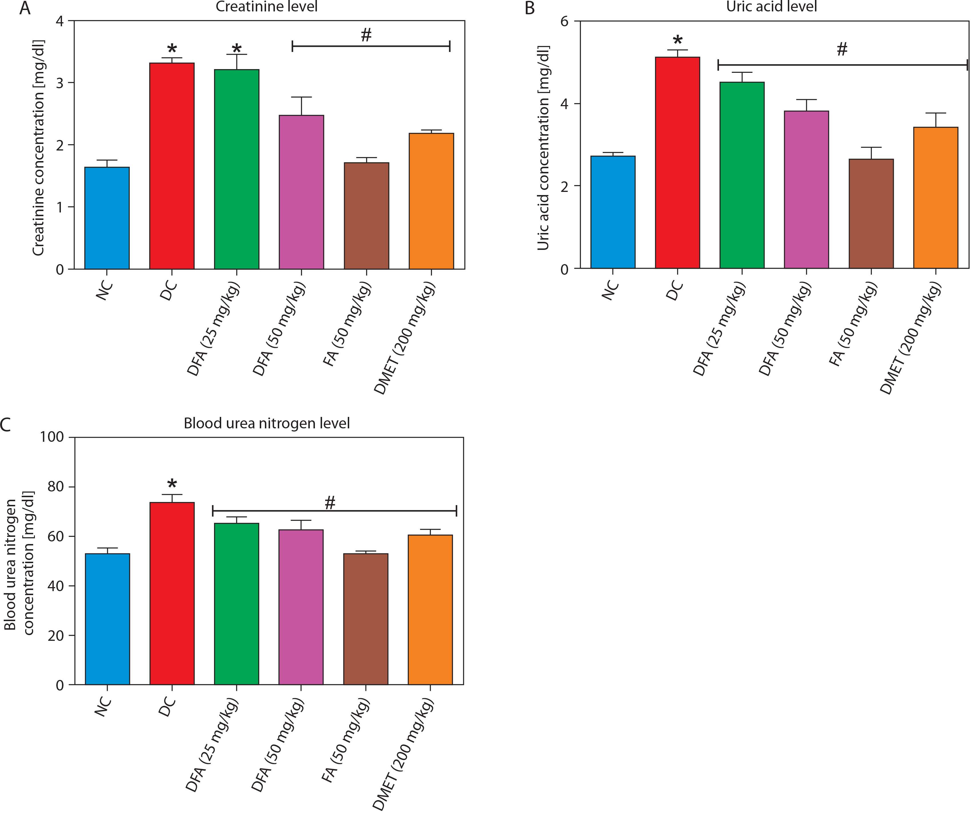 Effect of ferulic acid on (A) creatinine, (B) uric acid, (C) blood urea nitrogen. Values are mean ± SEM of five experimental animals (n = 5). Asterisk (*) represents a significant difference (p < 0.05) to the NC group, while # represents a significant difference (p < 0.05) to the DC group