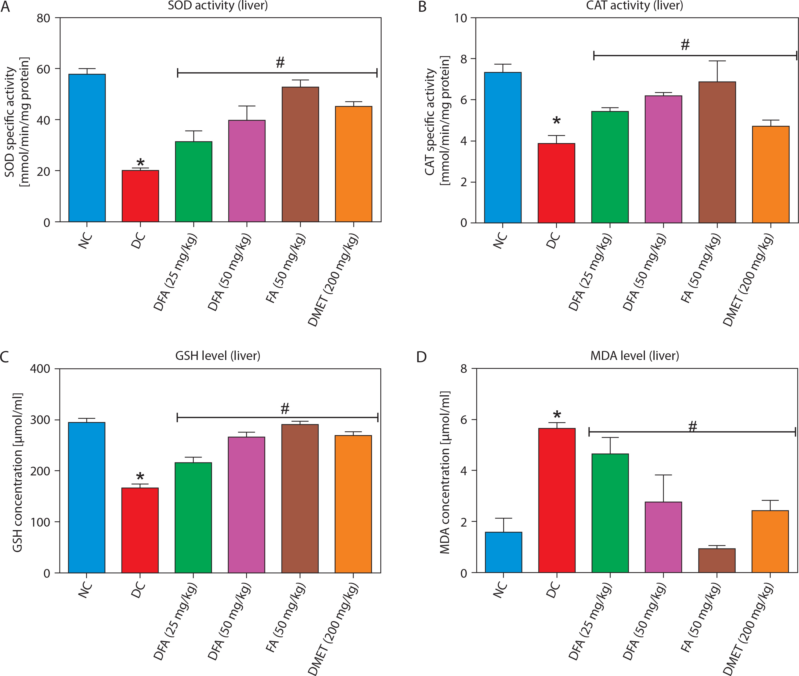 Effect of ferulic acid on specific activities of (A) SOD, (B) CAT, (C) GSH concentration, and (D) MDA level in liver. Values are mean ± SEM of five experimental animals (n = 5). Asterisk (*) represents a significant difference (p < 0.05) to the NC group, while # represents a significant difference (p < 0.05) to the DC group