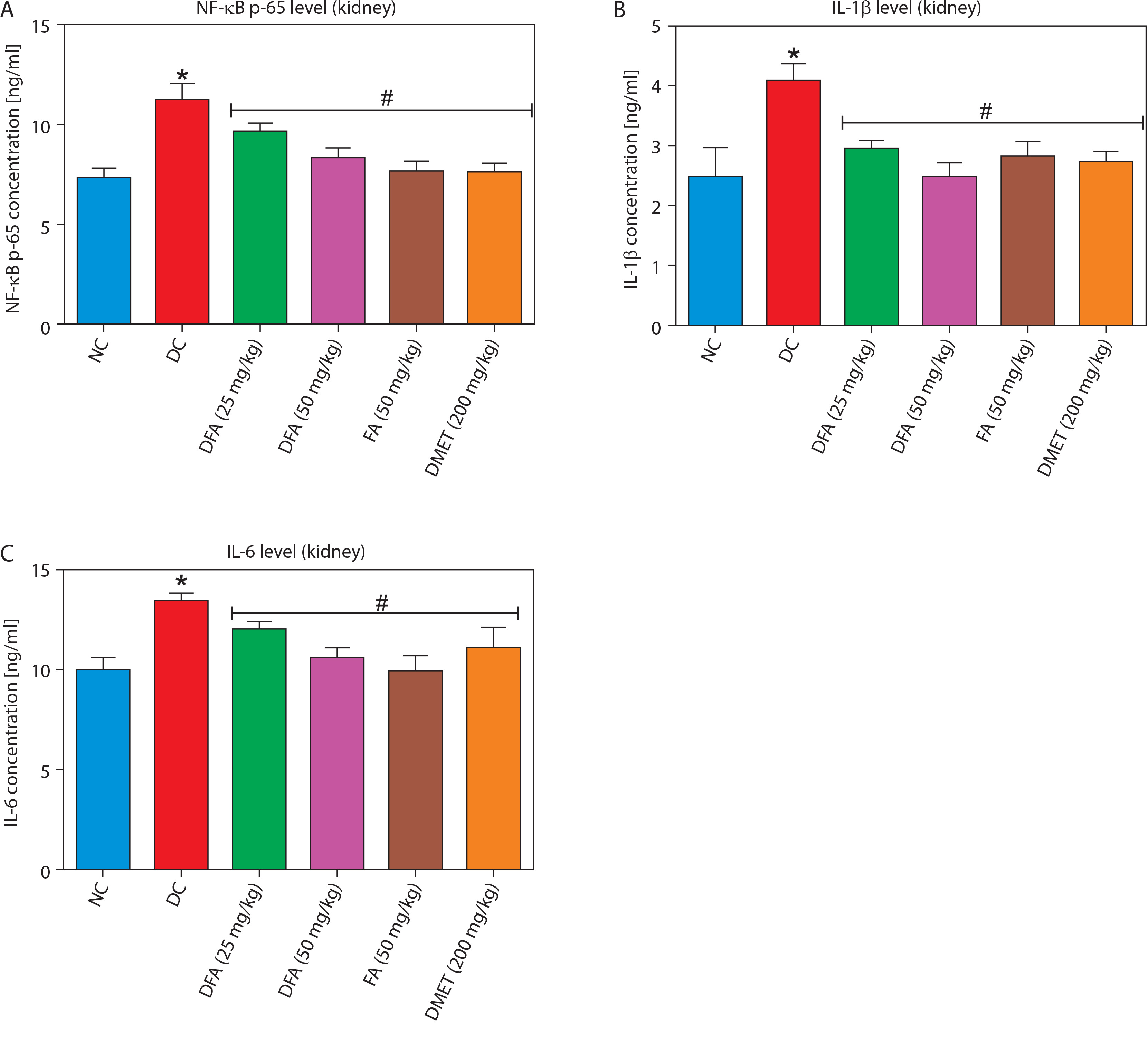 Effect of ferulic acid on (A) NF-κB-p65, (B) IL-1β, and (C) IL-6 protein levels in kidney tissue. Values are mean ± SEM of five experimental animals (n = 5). Asterisk (*) represents a significant difference (p < 0.05) to the NC group, while # represents a significant difference (p < 0.05) to the DC group