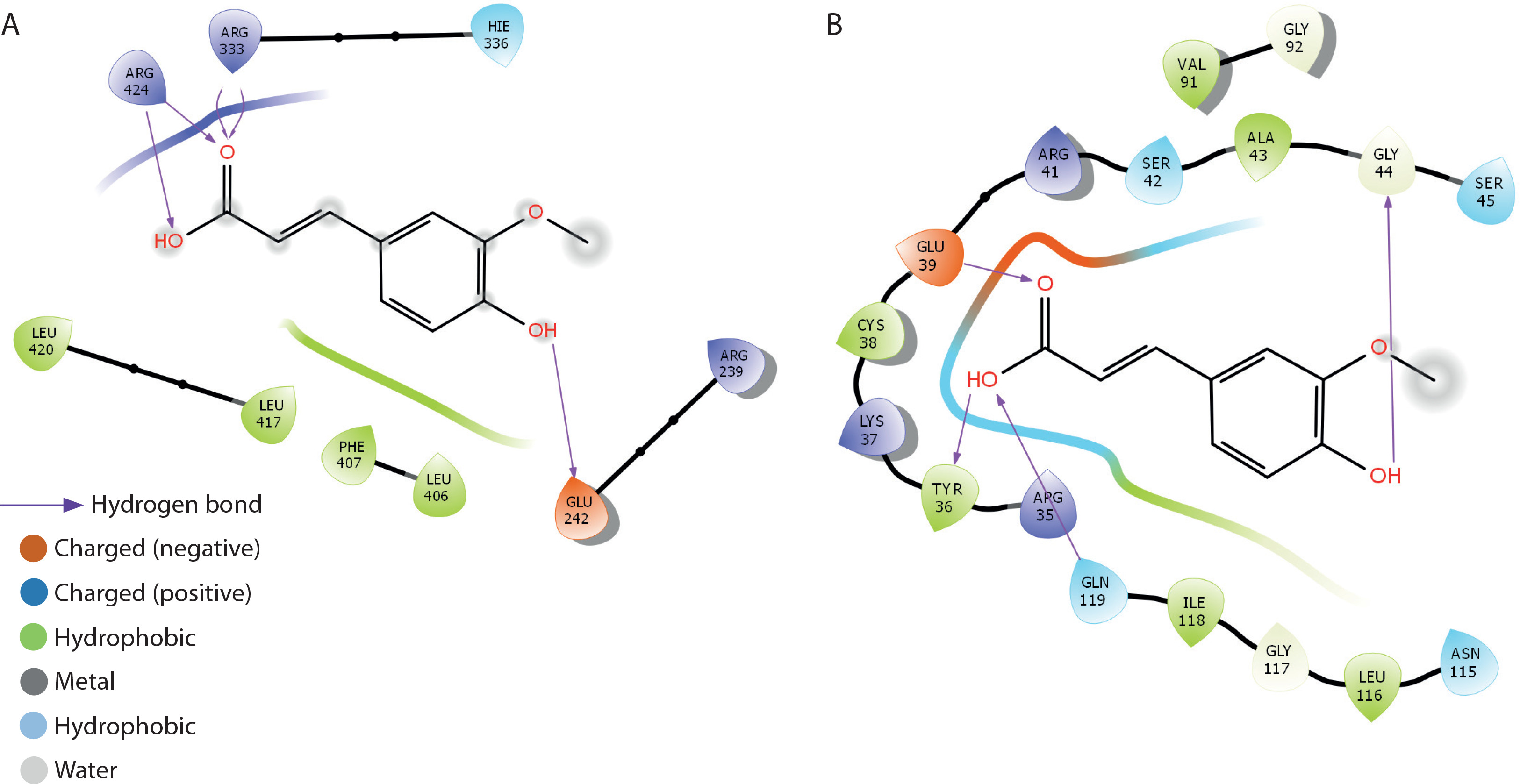 The binding interactions of FA with myeloperoxidase and NF-κB-p65 are presented in Table 2 and Figure 10A–B. FA exhibited strong binding affinities, with docking scores of –5.2 and –6.6 kcal/mol for myeloperoxidase and NF-κB-p65, respectively, outperforming metformin. The estimated free binding energies for FA with myeloperoxidase and NF-κB-p65 were –32.6 and –38.9 kcal/mol, respectively. The corresponding inhibition constants (Ki) were 1.19 × 10–24 M for myeloperoxidase and 2.24 × 10–29 M for NF-κB-p65, indicating much stronger binding affinities than those of metformin. The key interaction modes between FA and the amino acid residues within the active sites of the target proteins were primarily through hydrogen bonding. Specifically, FA formed hydrogen bonds with GLU-242, ARG-333, and ARG-424 in myeloperoxidase, and with TYR-36, GLN-44, and GLY-199 in NF-κB-p65.