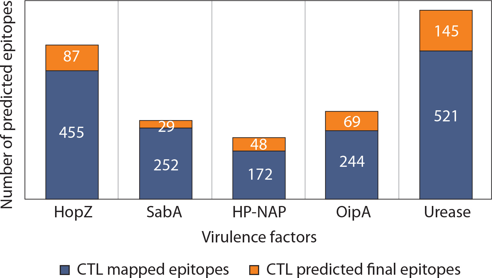 Comparative analysis of CTL epitope mapping and prediction across five major Helicobacter pylori virulence factors. The stacked bar chart illustrates the number of cytotoxic T lymphocyte (CTL) epitopes identified for each of the five virulence factors: HopZ, SabA, HP-NAP, OipA, and urease. Each bar is divided into two components: (i) CTL mapped epitopes (blue segment), representing the total number of epitopes identified using immunoinformatics tools based on binding affinity and immunogenicity, and (ii) CTL predicted final epitopes (orange segment), indicating the subset of mapped epitopes that passed stringent filters for antigenicity, non-allergenicity, non-toxicity, and population coverage criteria to qualify for final vaccine construct inclusion