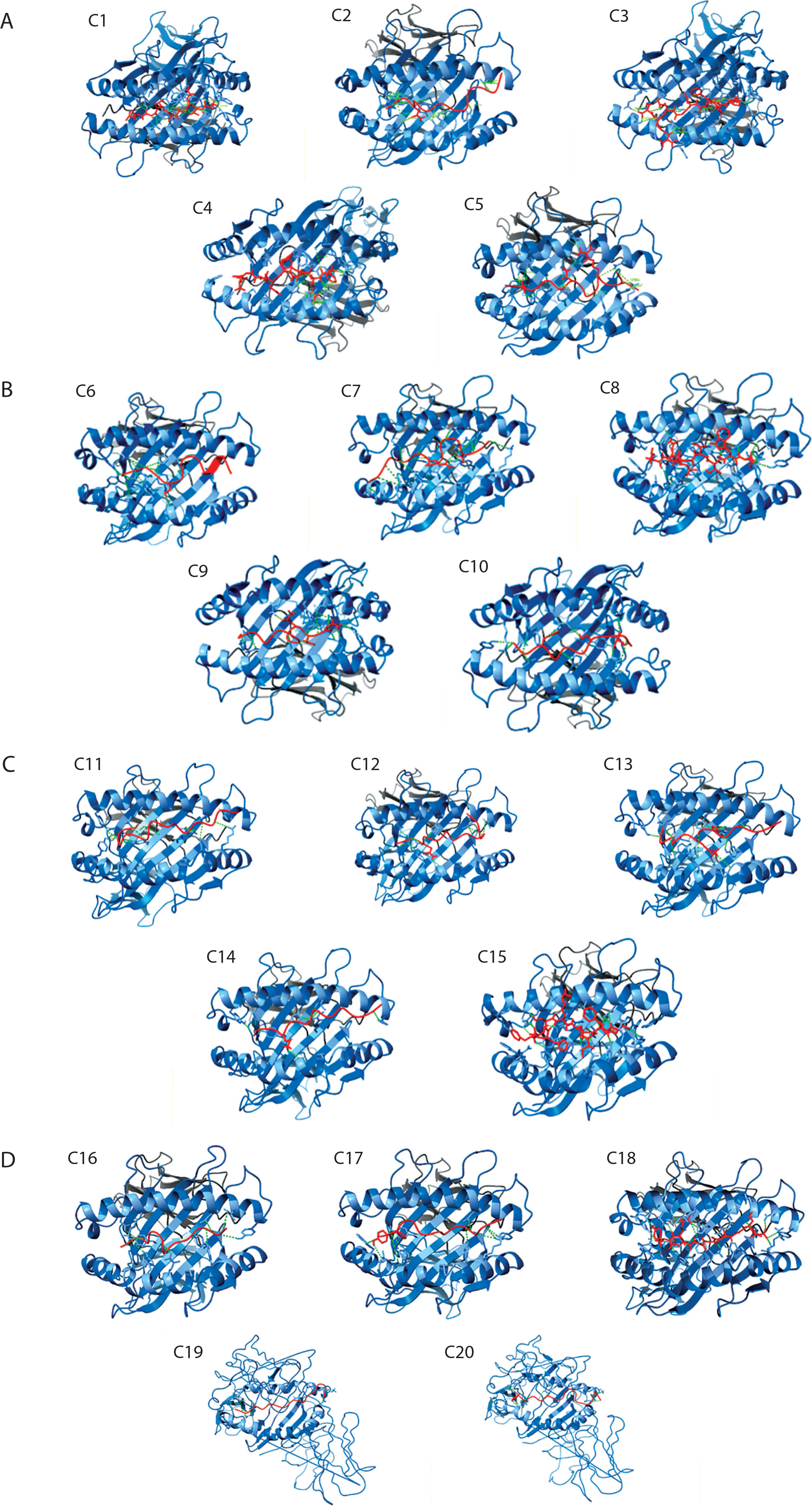 Molecular docking analysis of the top five predicted epitopes from the five virulence factors of Helicobacter pylori (A – HopZ; B – SabA; C – HPNAP; D – OipA; E – urease) showing the epitopes (colored in red) docked within the peptide binding groove of their corresponding HLAs with hydrogen bonds (green-dotted lines) as the main stabilizing intermolecular force