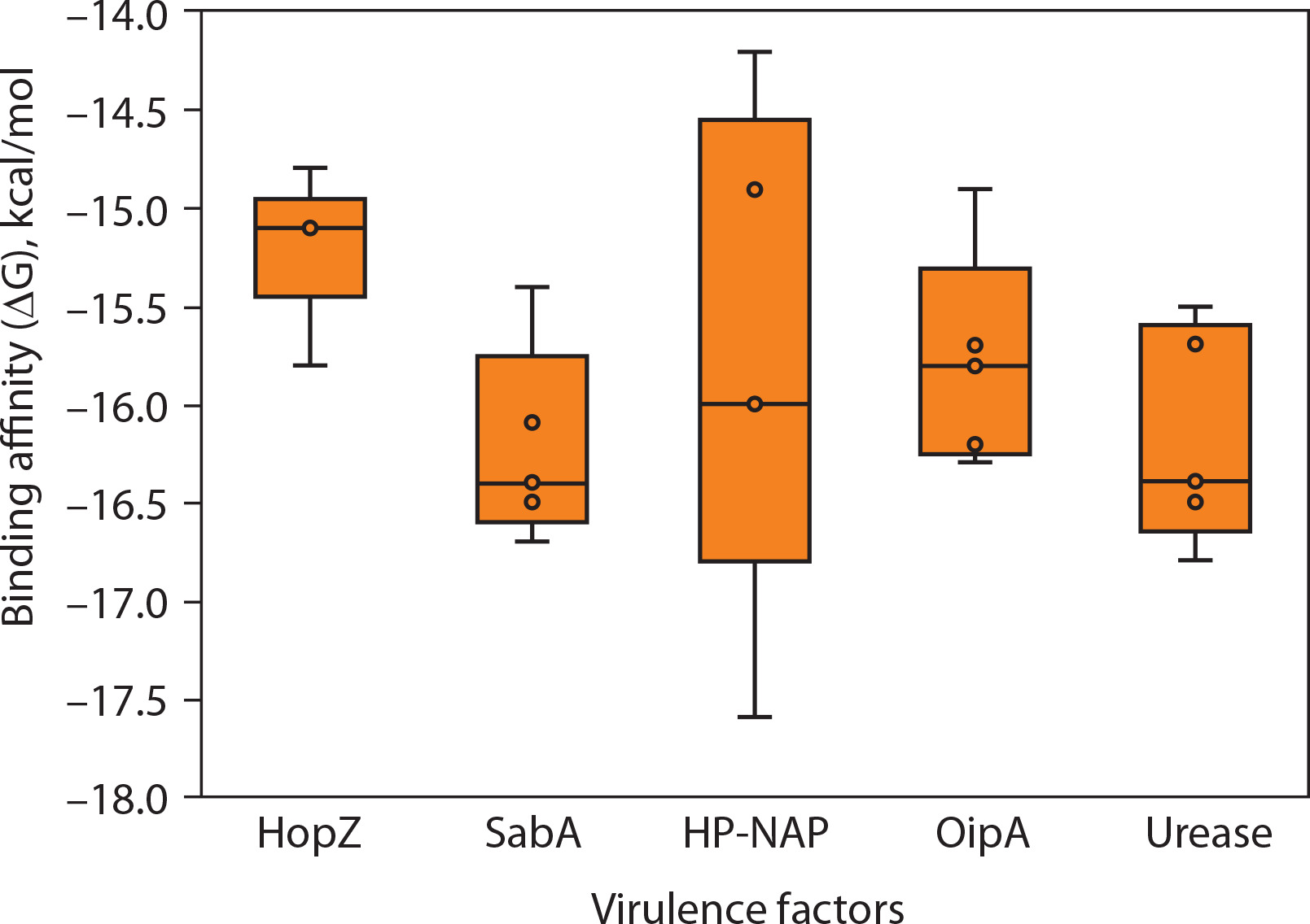 Predicted binding free energy (ΔG) of epitopes derived from Helicobacter pylori virulence factors. This panel presents the distribution of binding free energy (ΔG, in kcal/mol) values for epitopes originating from five H. pylori virulence factors: HopZ, SabA, HP-NAP, OipA, and urease. The ΔG values were obtained through molecular docking simulations, with more negative values indicating stronger predicted binding to MHC molecules. Among the evaluated factors, HopZ epitopes demonstrated the most favorable and consistent binding affinities, while HP-NAP epitopes exhibited the widest range and variability, reflecting diverse binding strengths. Each dot represents an individual epitope, with boxplots summari-zing the median, interquartile range, and full data spread