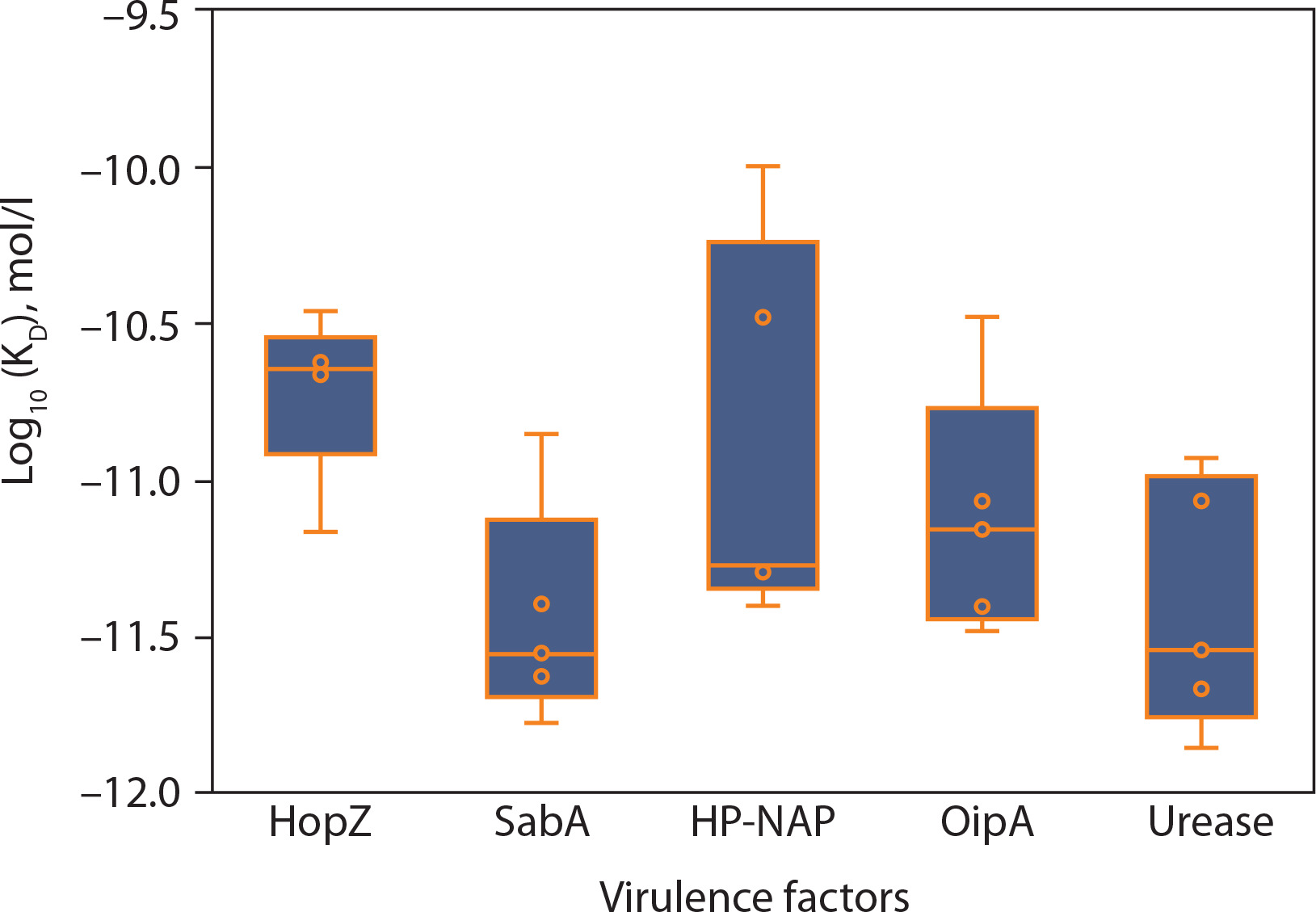 Predicted dissociation constant (KD) of epitopes from Helicobacter pylori virulence factors. This panel displays the log-transformed dissociation constant (log10 KD in mol/l) for the same set of epitopes, providing insight into binding stability. Lower KD values indicate tighter binding to MHC molecules. The overall trend aligns with the binding free energy data, with HopZ showing the most stable and uniform binding profiles, and HP-NAP again exhibiting a broader range of predicted affinities. Each point corresponds to a unique epitope, and the boxplots summarize the distribution of values across each virulence factor. These results support the prioritization of specific antigenic targets for vaccine design