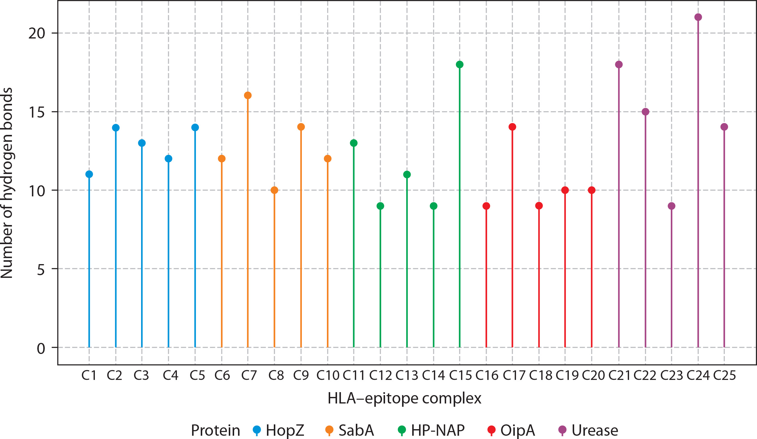 Hydrogen bond interactions between HLA molecules and predicted CTL epitopes from Helicobacter pylori virulence factors. The lollipop plot presents the number of hydrogen bonds formed in molecular docking simulations between selected HLA alleles and cytotoxic T lymphocyte (CTL) epitopes derived from five H. pylori virulence factors: HopZ (blue), SabA (orange), HP-NAP (green), OipA (red), and urease (purple). Each bar (C1–C25) corresponds to a distinct HLA-epitope complex. Hydrogen bonds, being key contributors to molecular stability and specificity, serve as a proxy for binding affinity and interaction strength. Notably, urease-derived epitopes (C21–C25) formed the highest number of hydrogen bonds (up to 21), suggesting robust and stable HLA interactions. In contrast, OipA epitopes showed comparatively fewer hydrogen bonds. These results support the structural feasibility and immunogenic promise of selected epitopes for downstream inclusion in multi-epitope vaccine constructs. Complexes were color-coded by their source protein to highlight intra-protein variability in HLA binding interactions