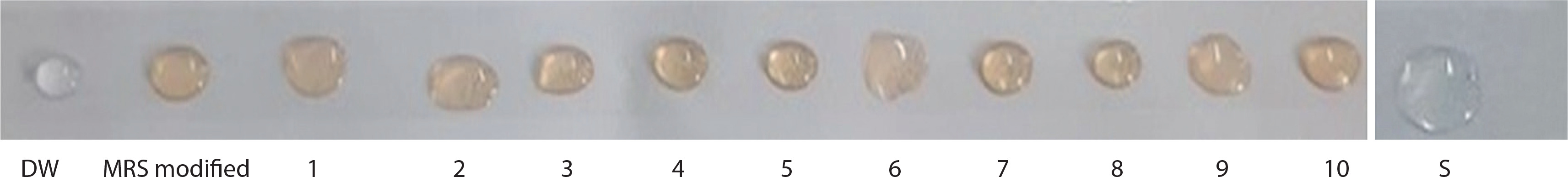 Drop collapse test is shown by different isolates of supernatant. DW – distilled water control, MRS modified – Man-Rogosa-Sharpe agar, S – positive control (SDS)