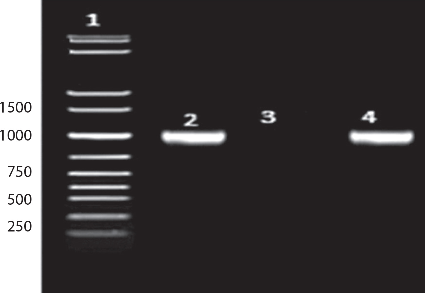 As shown in Figure 3: Lane 1: 1 kb DNA ladder; Lane 2: 16S amplicon (positive control); Lane 3: Negative control; Lane 4: Sample (Bht-2).