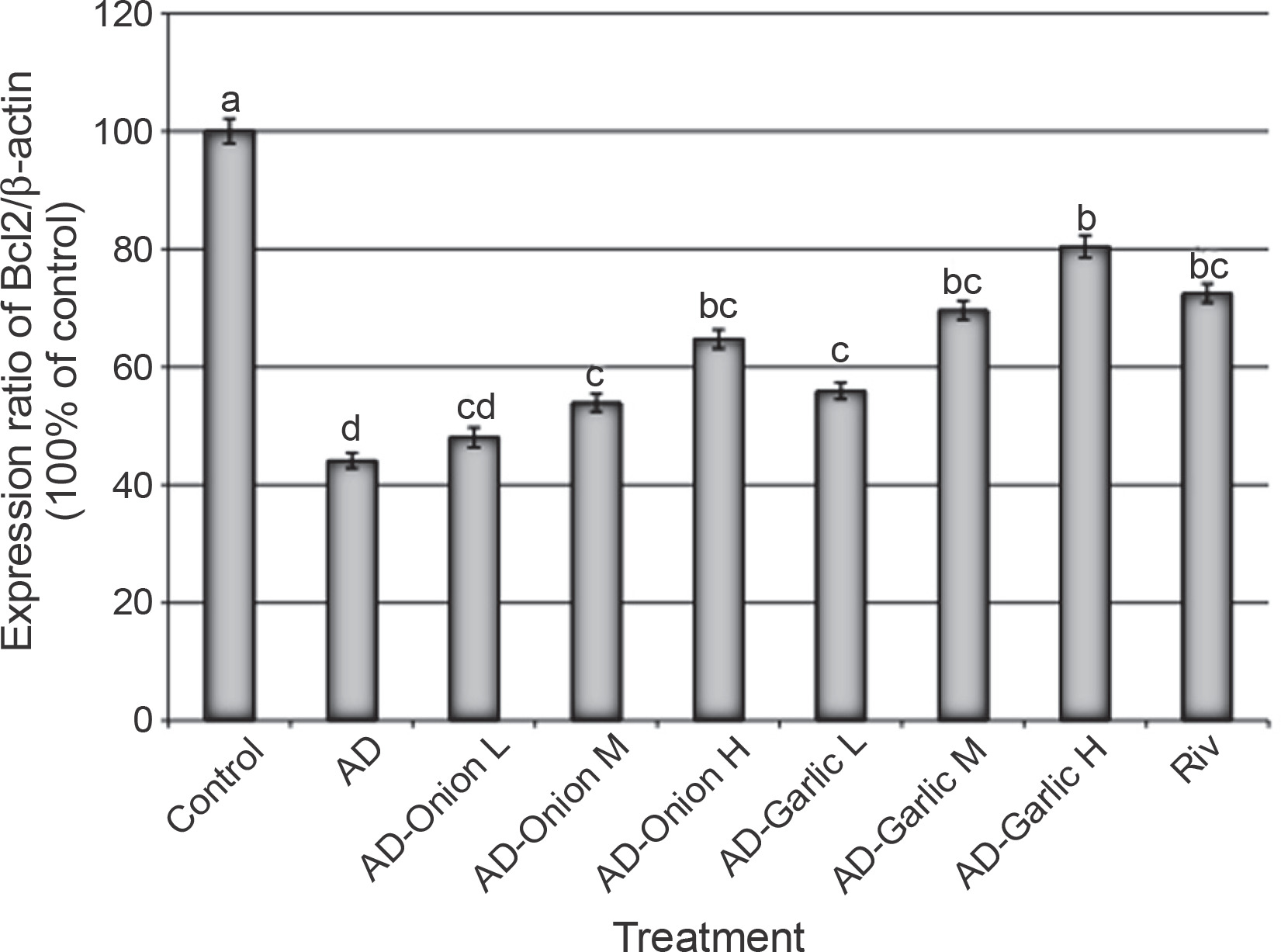 Alterations in the expression levels of the Bcl2 gene in brain tissues collected from AD-induced rats treated with low (L – 1 mg/kg), medium (M – 2 mg/kg), and high (H – 3 mg/kg) doses of the onion and garlic root extracts; data are presented as mean ± SEM; a, b, c, d – mean values within the tissue with different superscript letters were significantly different (P < 0.05)