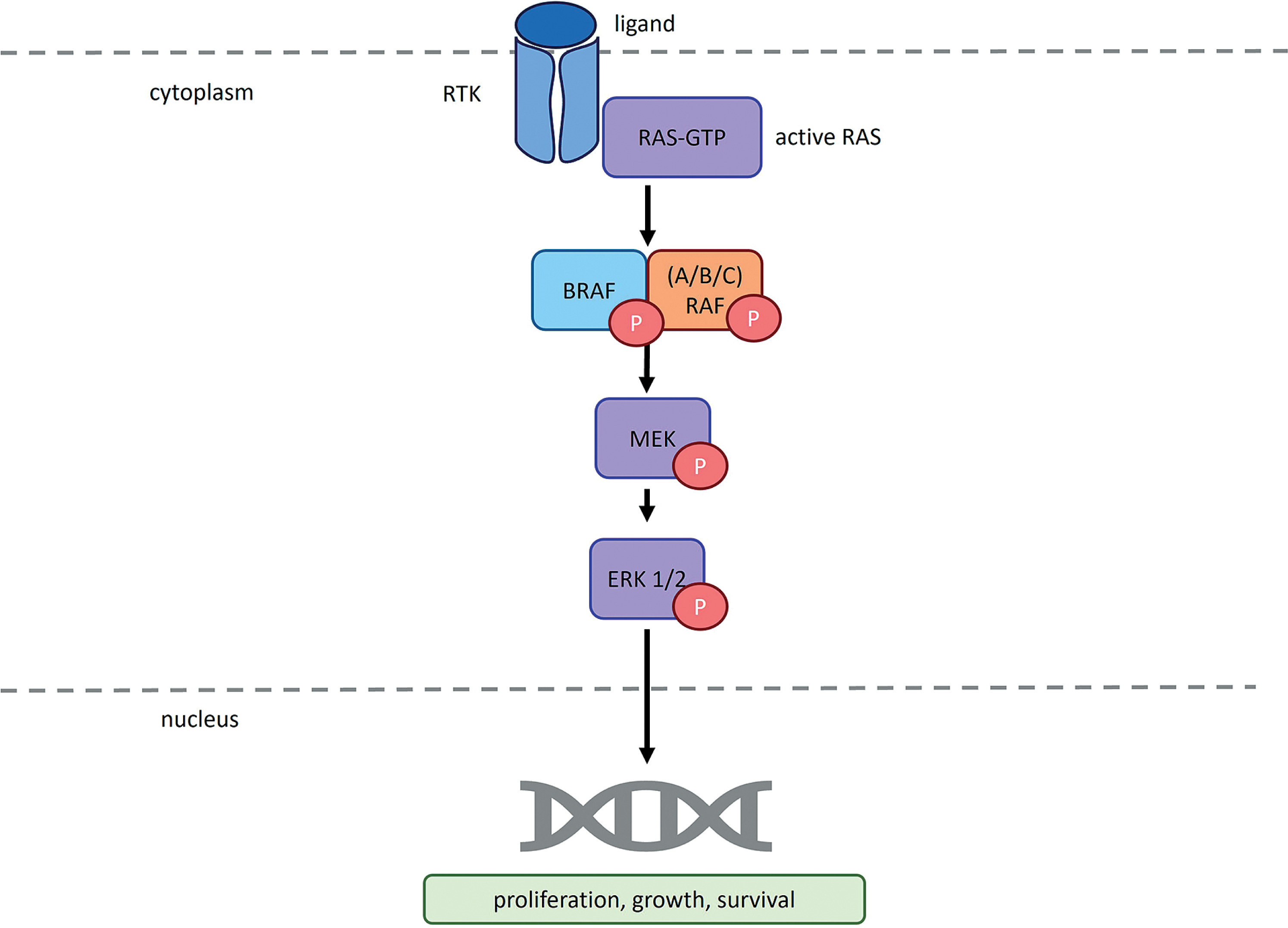 RAS/RAF/MEK/ERK pathway as it functions in cells lacking BRAF gene mutations. RTK – receptor tyrosine kinase; RAS – rat sarcoma virus protein; GTP – guanosine-5′-triphosphate; BRAF – serine/threonine-protein kinase B-Raf; ARAF – serine/threonine-protein kinase A-Raf; CRAF – serine/threonine-protein kinase C-Raf; P – phosphorus; MEK – mitogen-activated protein kinase; ERK1/2 – extracellular signal-regulated kinase 1/2. According to Planchard et al. (2024) and Smalley and Smalley (2018)