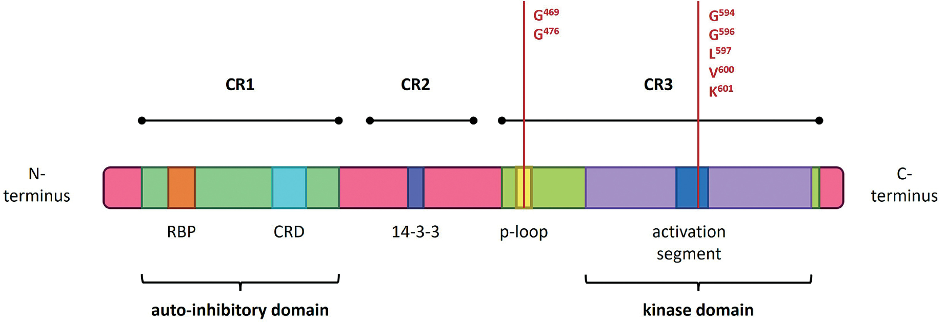 Structure of the BRAF gene, showing coding protein domains and the most frequent mutation. CR1/2/3 – conserved region 1/2/3; RBD – RAS-binding domain; CRD – cysteine-rich domain. According to Liu et al. (2020) and Yu et al. (2022)